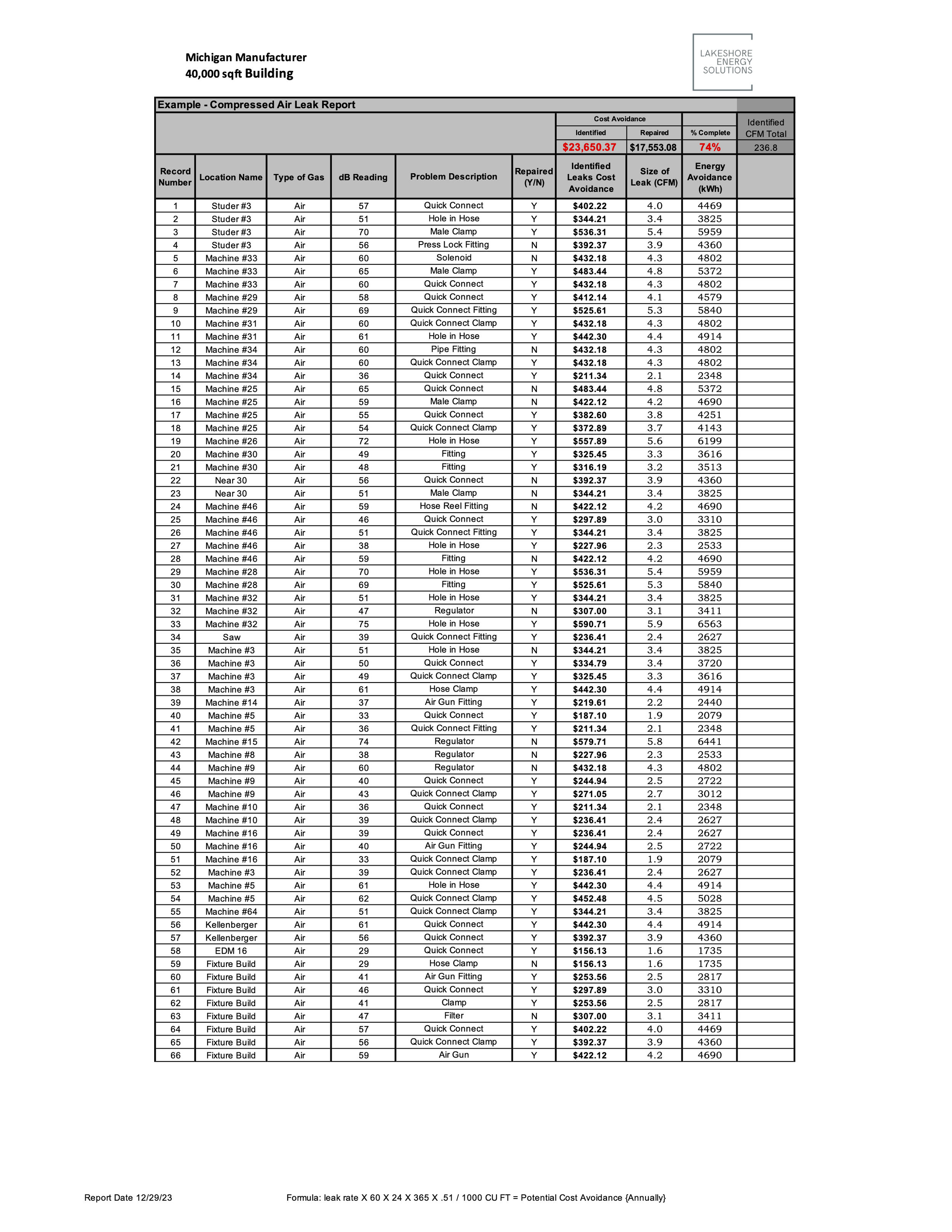 A certified technician will scan the entire facility for compressed air leaks using ultrasonic leak detecting technology. When a leak is identified, The technician will document what is causing the leak, the leak location, and how large the leak is.